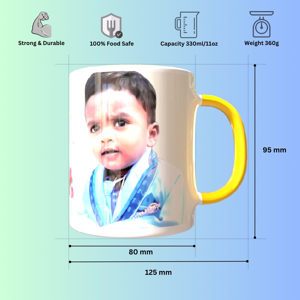 Celebrate special moments with our TPD71RHM6 Yellow Round Handle Mug, thoughtfully designed for kids surprises. This elegant and sturdy ceramic mug is perfect for showcasing your unique memories with custom photo and text printing options. Whether it's a heartfelt birthday wish, an anniversary date, or a fun cartoon for kids, your designs will shine on this glossy finish. The ergonomic round handle ensures a comfortable grip, making it a daily favorite for sipping tea, coffee, or hot chocolate. Ideal for gifting or daily use, our mugs are microwave and dishwasher safe, ensuring long-lasting prints and durability. Customize it with your artwork or a favorite quote to turn a simple mug into a cherished keepsake. Make every sip memorable with a gift that blends function, creativity, and emotion. Order now and create a personalized treasure that delights every time!