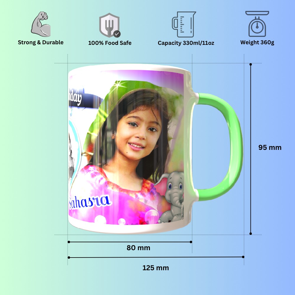 Celebrate special moments with our TPD51RHM7 Green Round Handle Mug, thoughtfully designed for kids surprises. This elegant and sturdy ceramic mug is perfect for showcasing your unique memories with custom photo and text printing options. Whether it's a heartfelt birthday wish, an anniversary date, or a fun cartoon for kids, your designs will shine on this glossy finish. The ergonomic round handle ensures a comfortable grip, making it a daily favorite for sipping tea, coffee, or hot chocolate. Ideal for gifting or daily use, our mugs are microwave and dishwasher safe, ensuring long-lasting prints and durability. Customize it with your artwork or a favorite quote to turn a simple mug into a cherished keepsake. Make every sip memorable with a gift that blends function, creativity, and emotion. Order now and create a personalized treasure that delights every time!