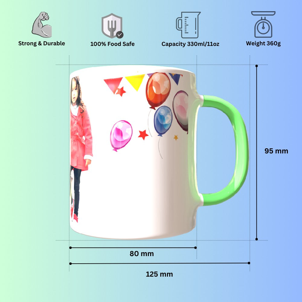 Celebrate special moments with our TPD61RHM7 Green Round Handle Mug, thoughtfully designed for kids surprises. This elegant and sturdy ceramic mug is perfect for showcasing your unique memories with custom photo and text printing options. Whether it's a heartfelt birthday wish, an anniversary date, or a fun cartoon for kids, your designs will shine on this glossy finish. The ergonomic round handle ensures a comfortable grip, making it a daily favorite for sipping tea, coffee, or hot chocolate. Ideal for gifting or daily use, our mugs are microwave and dishwasher safe, ensuring long-lasting prints and durability. Customize it with your artwork or a favorite quote to turn a simple mug into a cherished keepsake. Make every sip memorable with a gift that blends function, creativity, and emotion. Order now and create a personalized treasure that delights every time!